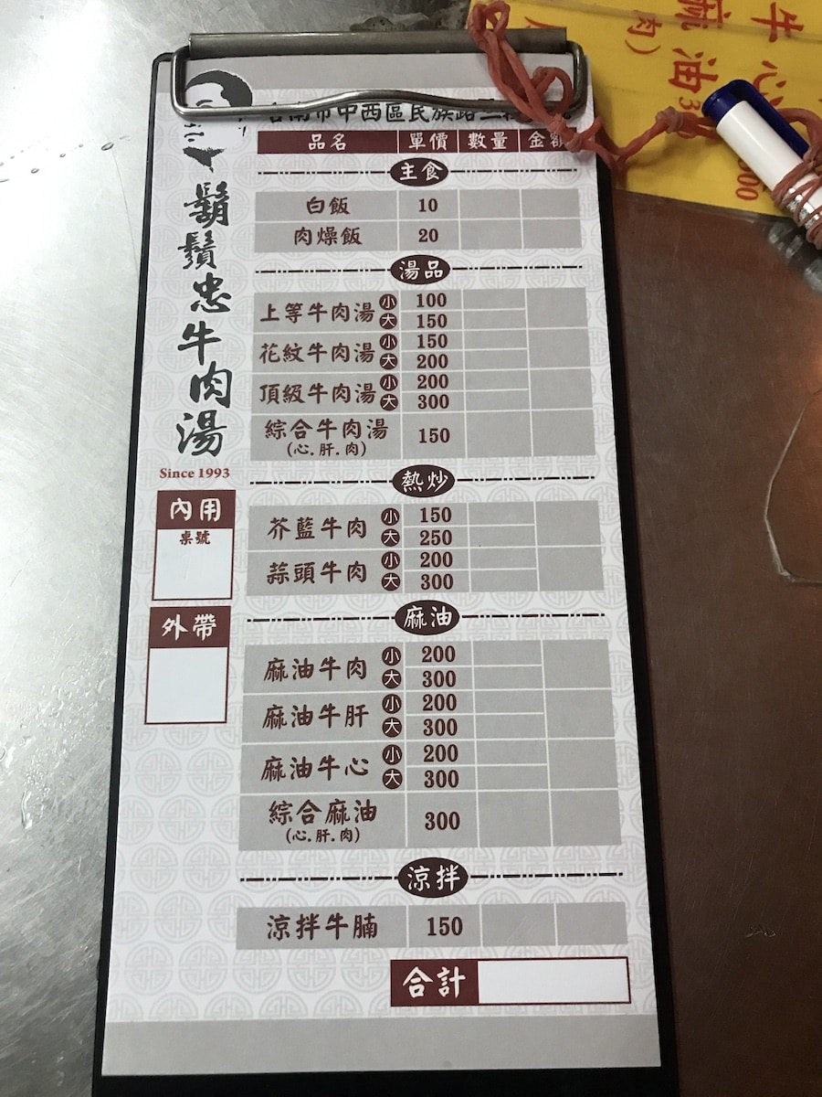附上台南鬍鬚忠的菜單,光是牛肉湯就有分成頂級、花紋、上等共三種等級,熱炒類餐點有芥藍牛肉與蒜頭牛肉,還有透過麻油來提味的麻油牛肉、麻油牛肝、麻油牛心與相當開胃的涼拌牛腩,大部分菜色都有大份和小份兩種選擇。