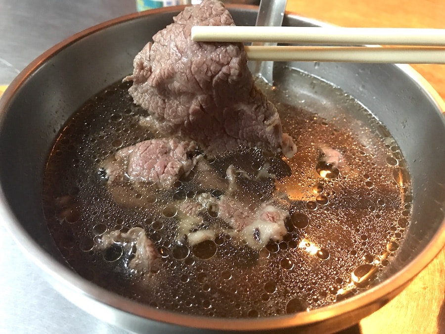 牛肉湯在用料上採用新鮮現宰的溫體牛肉,吃起來口感厚實且有嚼勁,上等牛肉口感偏碎較不扎實,花紋牛肉雖然口感厚實但肉質偏硬筋也較多,而頂級牛肉口感鮮嫩Q彈且熟度也恰到好處,保證會讓您一吃成主顧,若想要增加口感層次,您可以到醬料區自取特製豆瓣醬搭配牛肉一起吃。