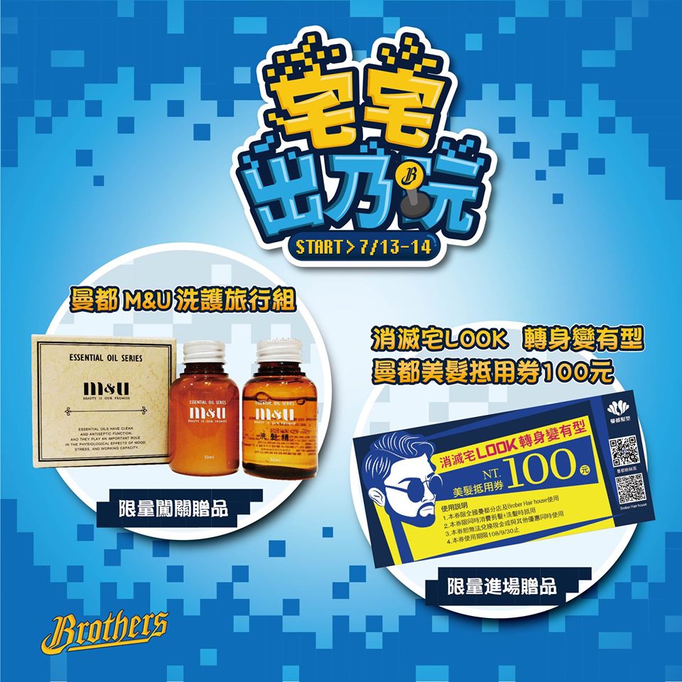 活動期間進場的宅宅們,將獲得國內美髮連鎖業的龍頭「曼都髮型」獨家贊助的「消滅宅 LOOK 轉身變有型」折價券,現場還有「三宅一身」闖關遊戲,只要順利完成,即可領取曼都限量闖關贈品 M&U 洗護旅行組,讓你從頭到腳煥然一新,展現最陽光的一面!