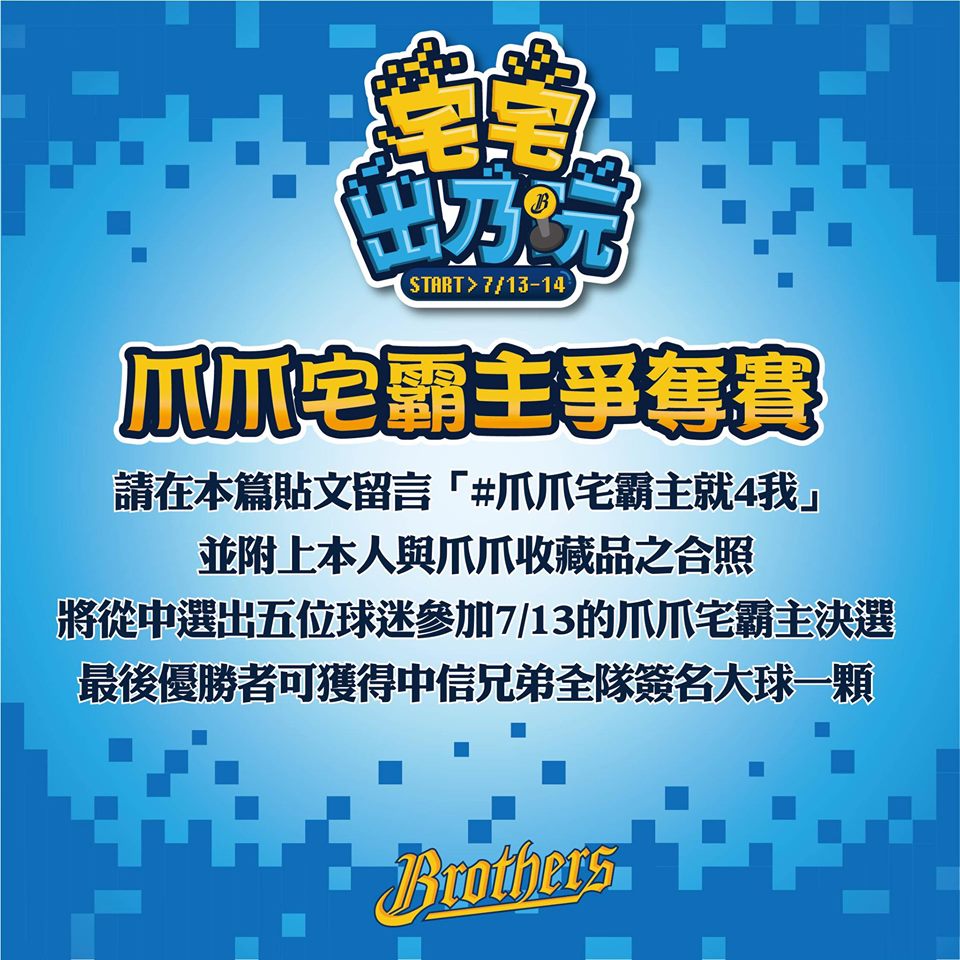 正式活動前,中信兄弟官方粉絲團「兄弟 Fans Club」目前正舉辦「爪爪宅霸主爭奪賽」募集爪爪宅界中的霸主,只要你自認是死忠爪迷,擁有數不盡的爪爪收藏品,還有一顆無敵熱愛爪爪的心,請於活動貼文中留言參與初選,就有機會登上7/13 的決選擂台,和爪爪宅們一較高下,成為天下第一的「爪爪宅霸主」!