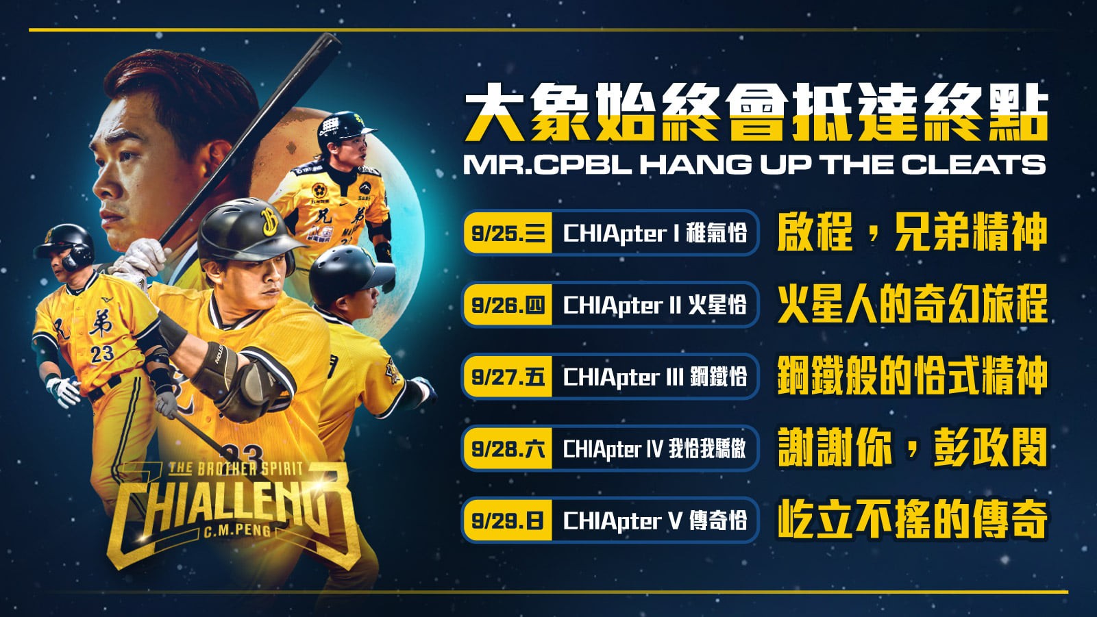 9/25 ~ 9/29「CHIAllenge」恰恰彭政閔引退週將區分為五個「CHIApter」,從 2001年剛入團的稚氣恰、帶來一場一場奇幻演出的火星恰、國際賽肉身擋球的鋼鐵恰,到最後成為棒球迷心中永遠的驕傲與傳奇。本週洲際棒球場不只場外佈置會充滿彭政閔,球場大螢幕也會有滿滿的彭政閔,不只有彭政閔每個時期的經典影片還有不進場就看不到的花絮影片,中場與局間活動也有「恰迷的考驗」有獎徵答比賽及「我恰我驕傲 CAM」等等,「奪冠之路需要一步一步來,大象雖然走得慢,但還是會走到終點!」這是 2016年彭政閔於季後賽講出的恰式經典語錄。而此刻大象即將抵達終點,在邁入終點的最後一哩路,讓我們攜手一起走。