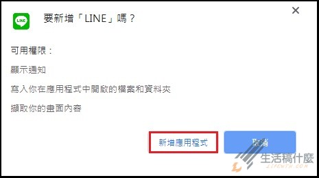 完成上圖步驟後,會彈出一個對話視窗詢問是否要新增LINE,點擊【新增應用程式】。