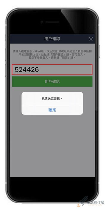 開啟手機的 LINE APP 並將剛剛獲得【認證碼】輸入到下圖紅框處,輸入完成後點擊【用戶確認】。