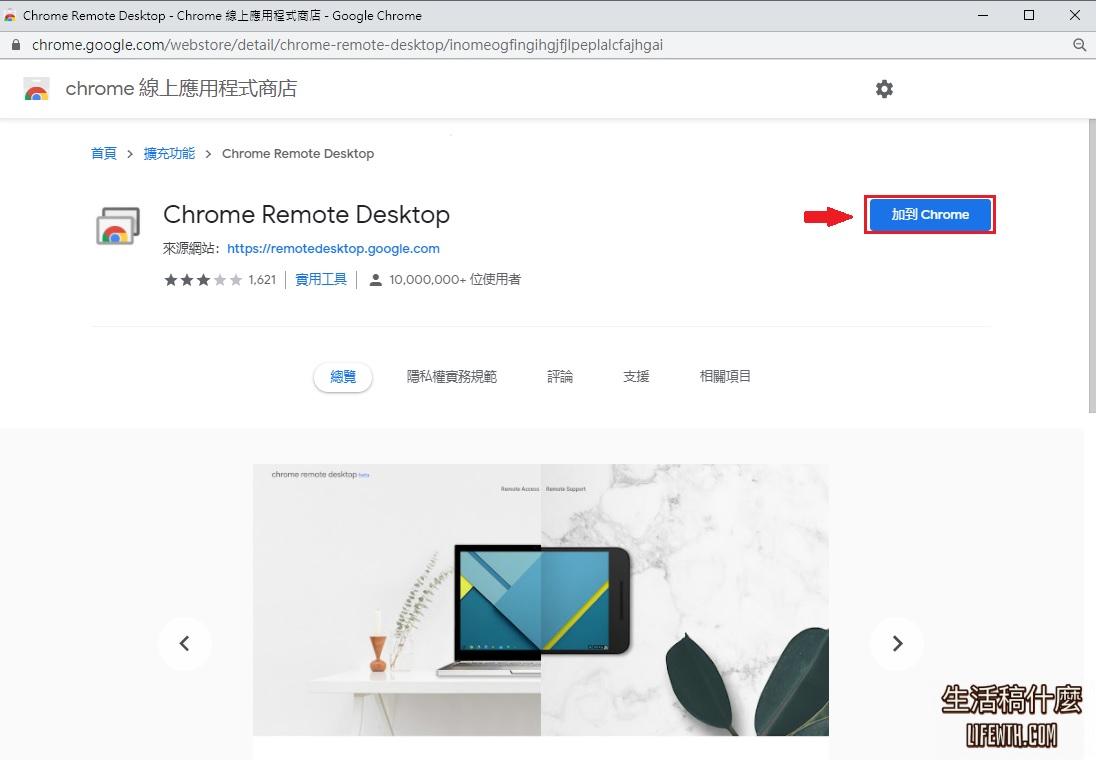 點擊右下角的「下載符號」前往Chrome應用程式商店,接著將Chome Remote Desktop加入擴充功能中。