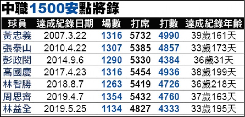 悍將神拳 林益全在今日 4 局下半擊出三游方向滾地安打,不僅成為聯盟現役第 5 位、史上第 7 位達成生涯1500安的球員更是史上最快速(11年)、最少場次(1134場)、最少打席(4827)、最少打數(4333)完成此紀錄的選手。