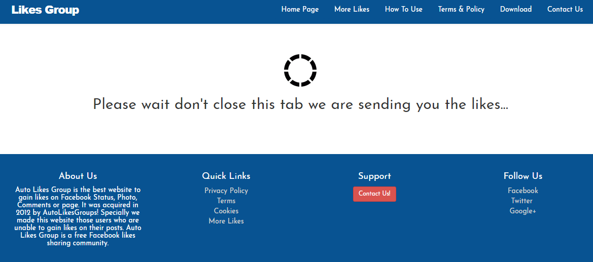 步驟九:看到這頁面出現後系統就會自動發送讚給您的粉絲專頁,這時候網頁先不要關閉不然可能會有影響到系統發送讚,如不小心關閉的話就必須還要等15分鐘才能進行下一次操作。