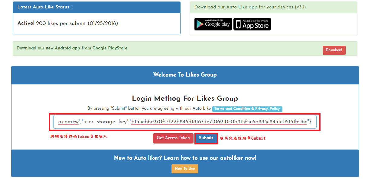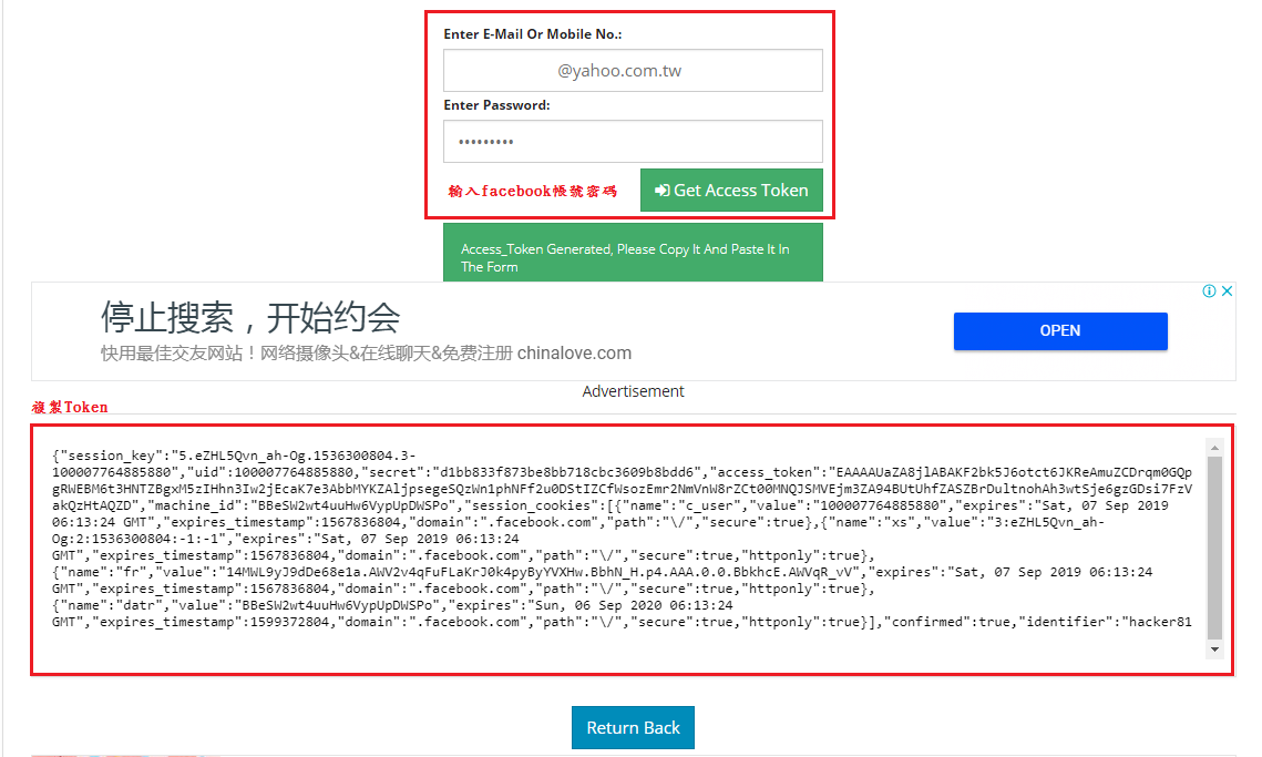 步驟三:將Email欄位輸入您申請Facebook的Email帳號,Password欄位中輸入Facebook密碼,這邊建議大家另外開一個新的分身帳戶來執行,因為不知道帳號密碼是不是會被網站給紀錄拿去做其它用途,例如幫別人粉絲團點讚之類的,完成後點擊下方Get Access Token下方會出現Token代碼,將其全部複製起來等等要拿來認證使用,完成後點擊ReturnBack回到前一頁。