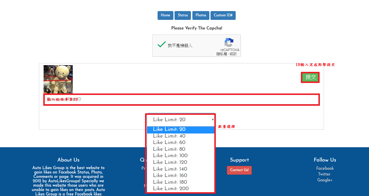 步驟六:選擇您要點讚類型,有分PO文狀態點讚(Status Like)、圖片點讚(Picture Like)、顧客點讚(Custom Like),這邊因為是要幫顧客的粉絲專業點讚,因此選擇Custom Like。