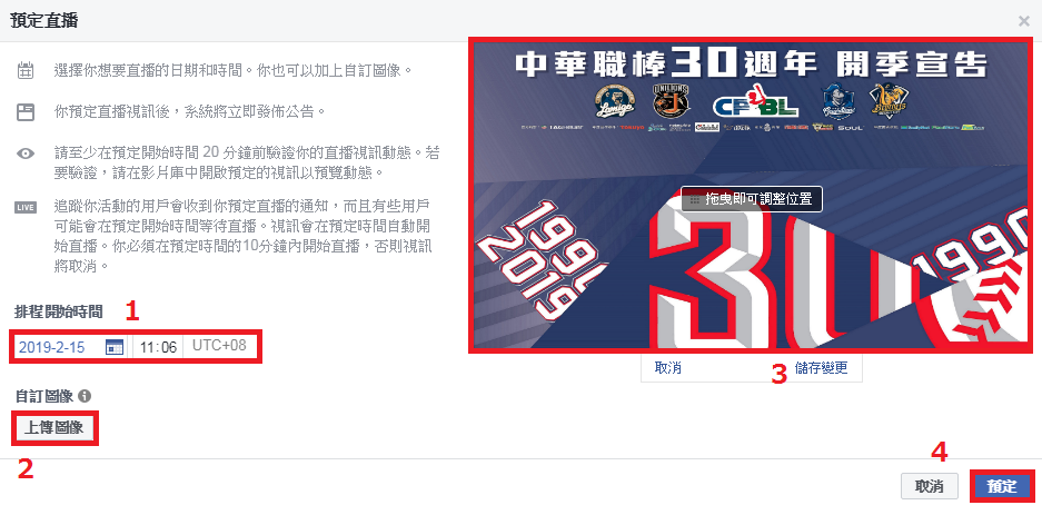 步驟三:填寫預定的直播時間 → 上傳圖像與儲存 → 點擊右下角預定。