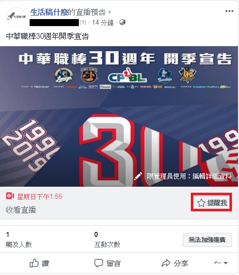 步驟四:完成步驟三之後,就可以在粉絲專頁上看到直播預告已被建立,如果粉絲有點擊提『提醒我(下圖紅框)』,即會在直播開播之前3分鐘通知有預定的粉絲們,這樣只要您一開播粉絲們馬上就會收到直播即將開播消息,最後請切記你必須在預定時間的10分鐘內開始直播,否則直播將會被取消。