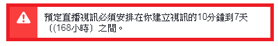 請特別注意:預定直播有時間範圍限制,需在『10分鐘內~7天之間』。