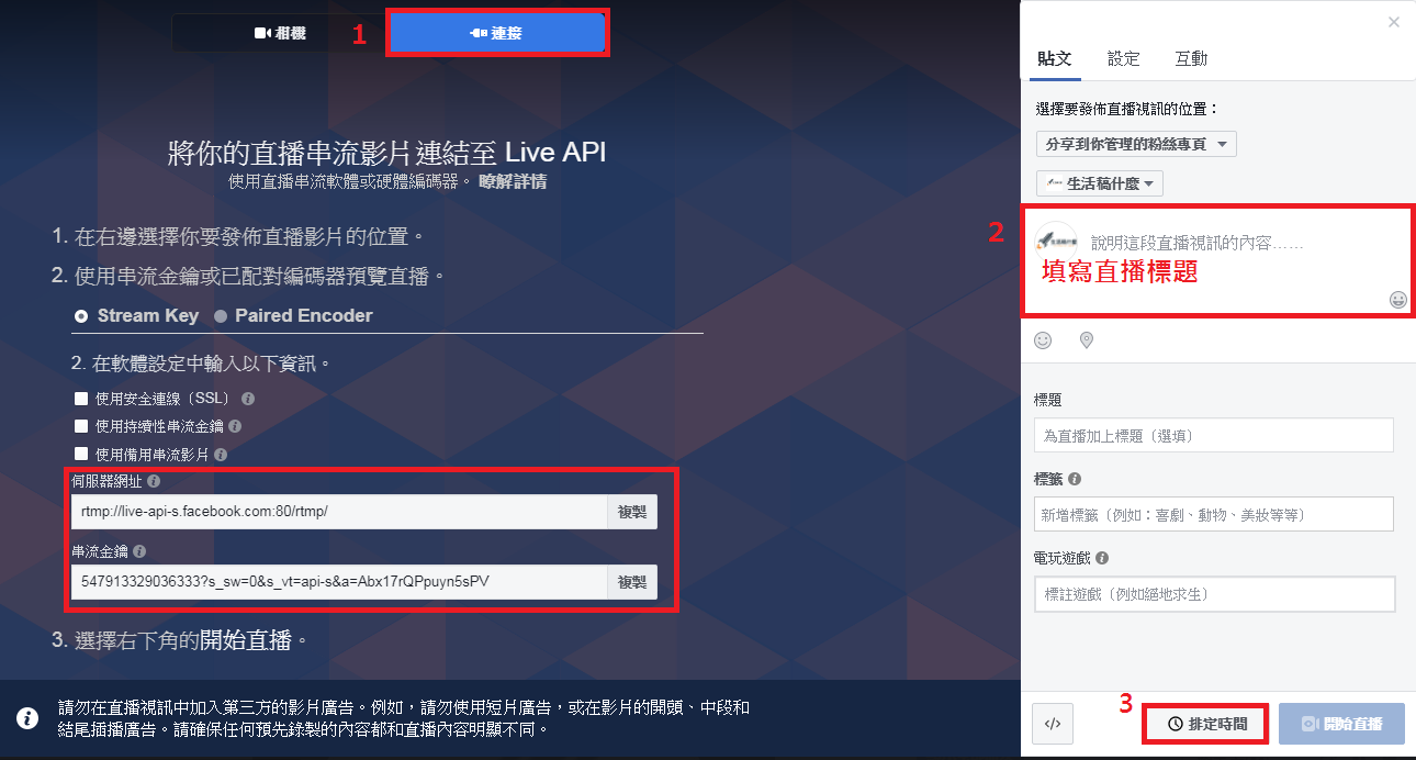 備註:【伺服器網址】與【串流金鑰】跟 直播軟體obs studio 連接時會需要用到,在直播前20分鐘,系統會自動要串接金鑰來確認訊號有接上FB,另外需特別注意的是,當設定好直播預告並發佈之後,若是將金鑰串接至直播軟體,則需要五小時內開始正式直播,因此如果預定多日排程,建議在直播前再進行金鑰的串接,才不會讓預約直播的金鑰失效。