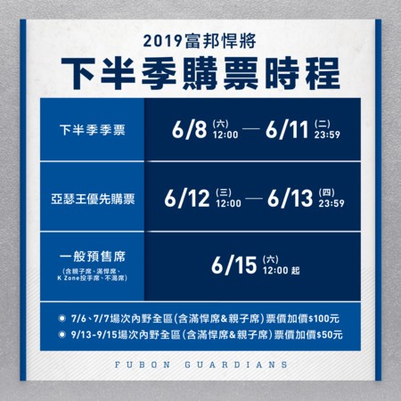 亞瑟王家族會員於6月12日12點至6月13日23:59享有優先購票權。6月15日12下半季單場預售票全面開放選購(含滿悍席/親子席/投手席/不渴席)。