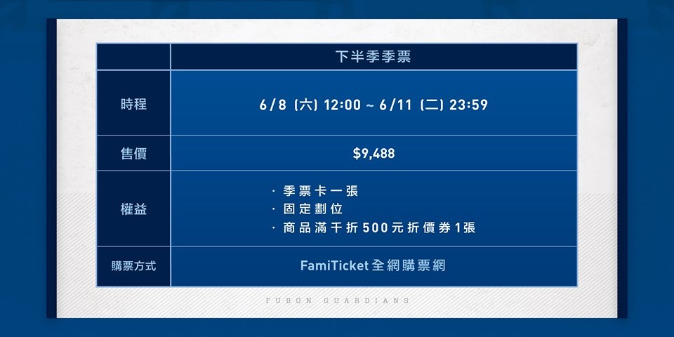 富邦悍將2019年下半季主場例行賽將持續與FamiTicket全網購票網及全家FamiPort機台合作,下半季季票於6月8日中午12點至6月11日23:59開賣。