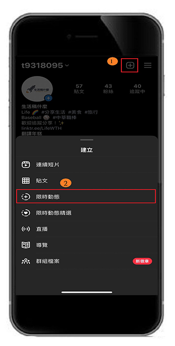 若您要想在IG限時動態中加入兩張照片,首先我們打開Instagram App,點擊上方”+”號新增一則限時動態。