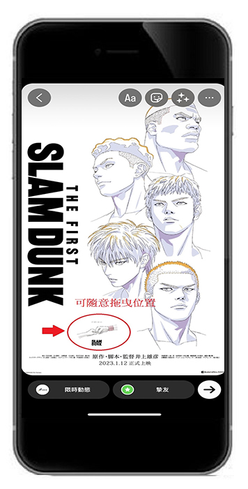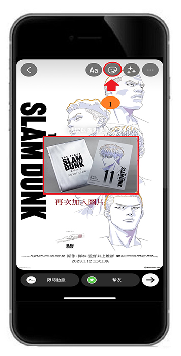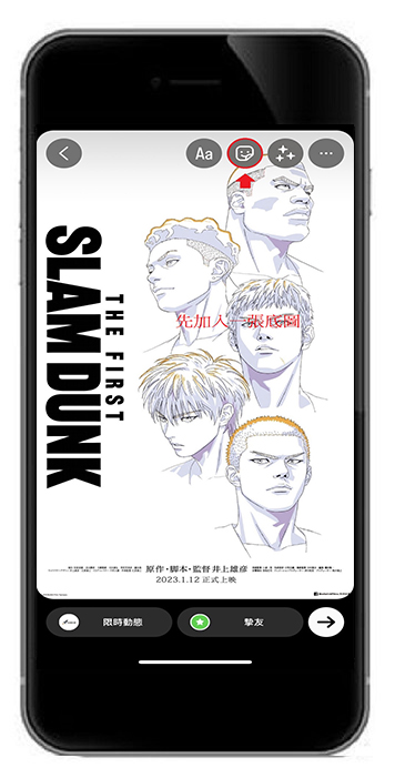若想在IG限動中再次加入照片,只要重複之前的步驟,點擊笑臉圖示 > 插入照片。
