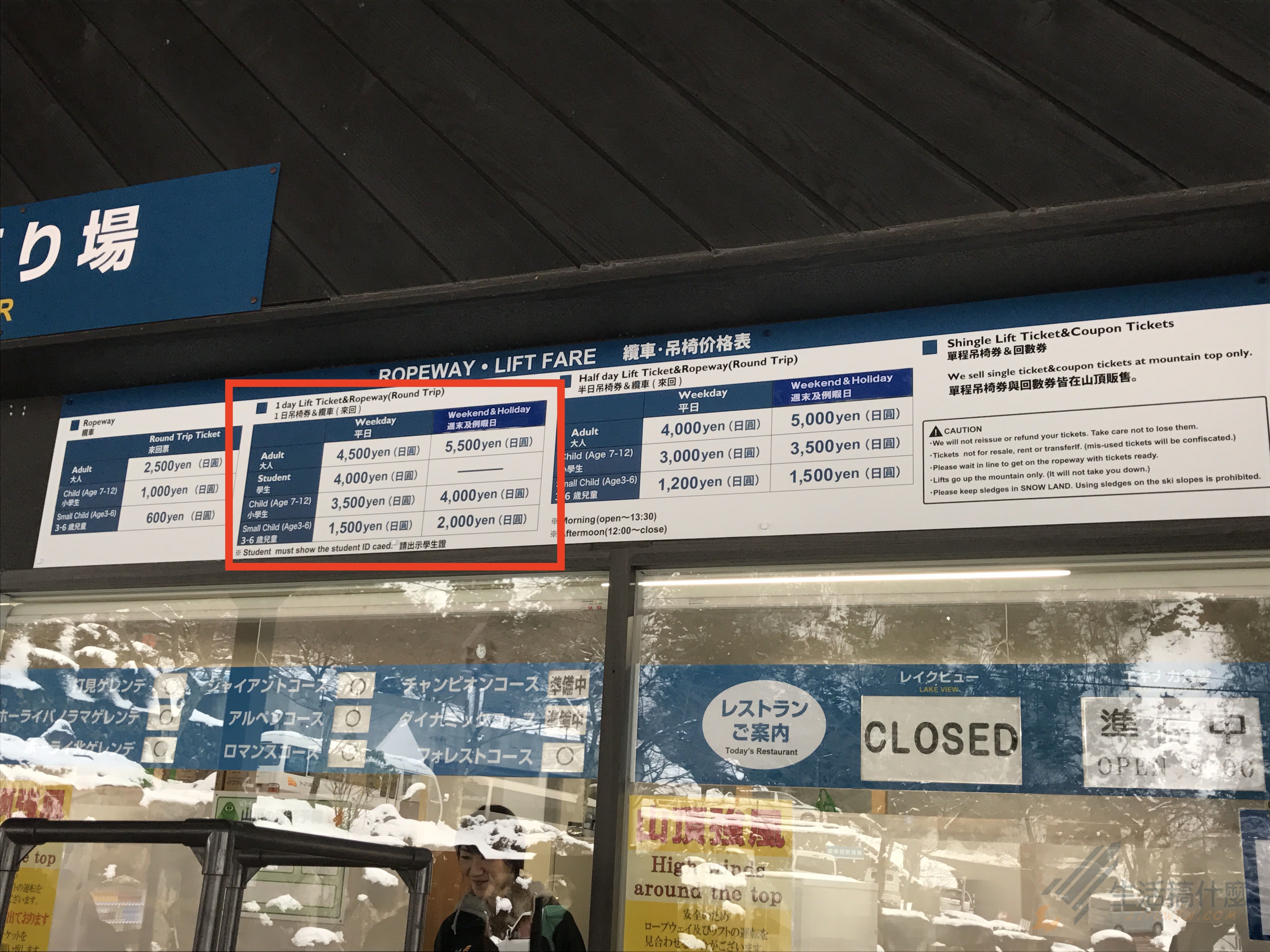 購票項目如下,當天小編主要是購買一日纜車+吊椅卷,如果沒有要滑雪單純上去看景色的話可以選擇纜車卷即可。