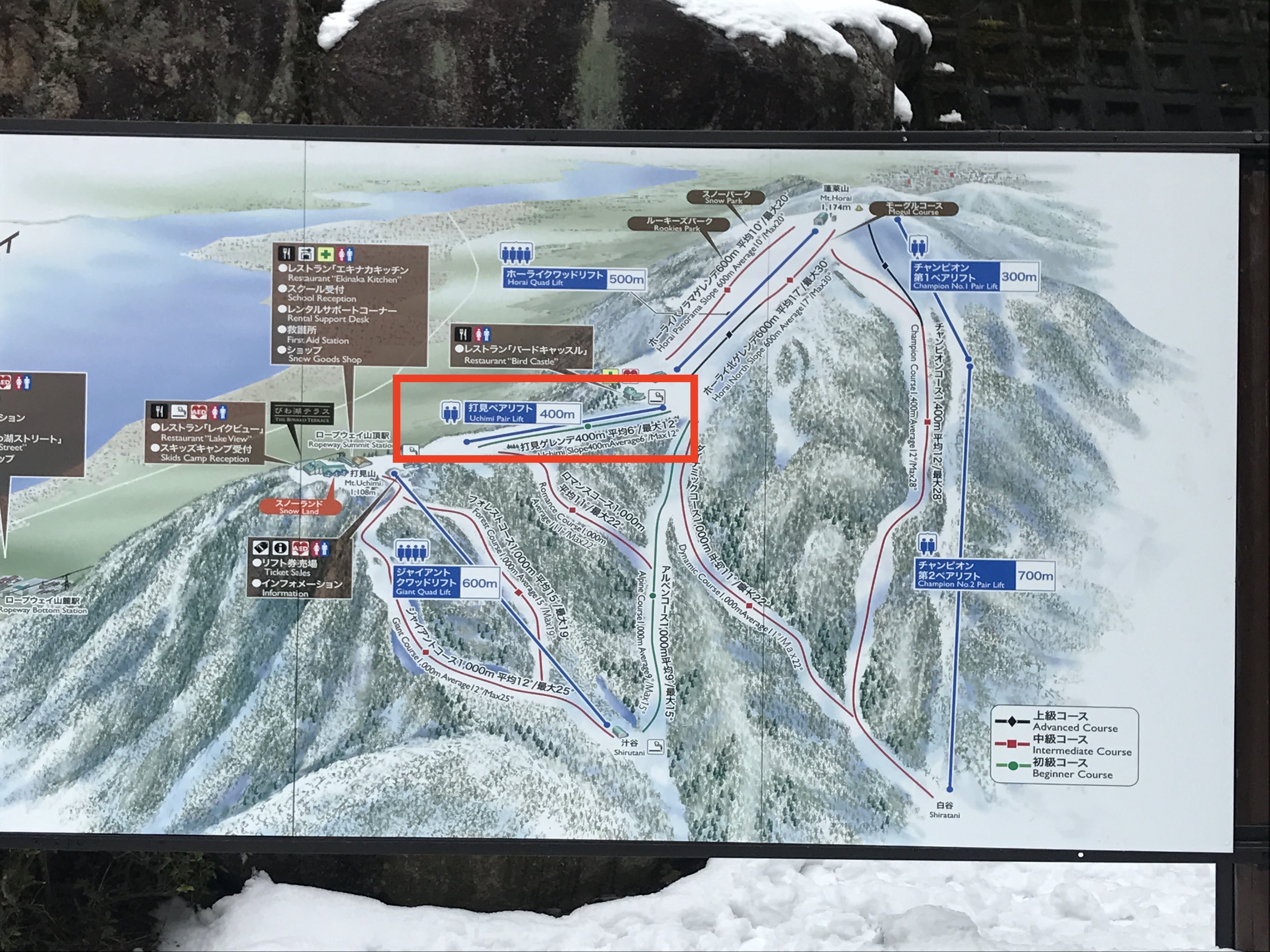 下圖為整座山的滑雪道介紹圖,如果您是新手的話可以嘗試先滑『打見』400m的長直線滑雪道(下圖紅框處),琵琶湖滑雪場很多滑道雖然標示為初級滑道,但與輕井澤的初級滑道相比難度與坡度上相對的較困難許多,不過還好是天然雪,其實一路摔下山應該也是不會太痛的啦。