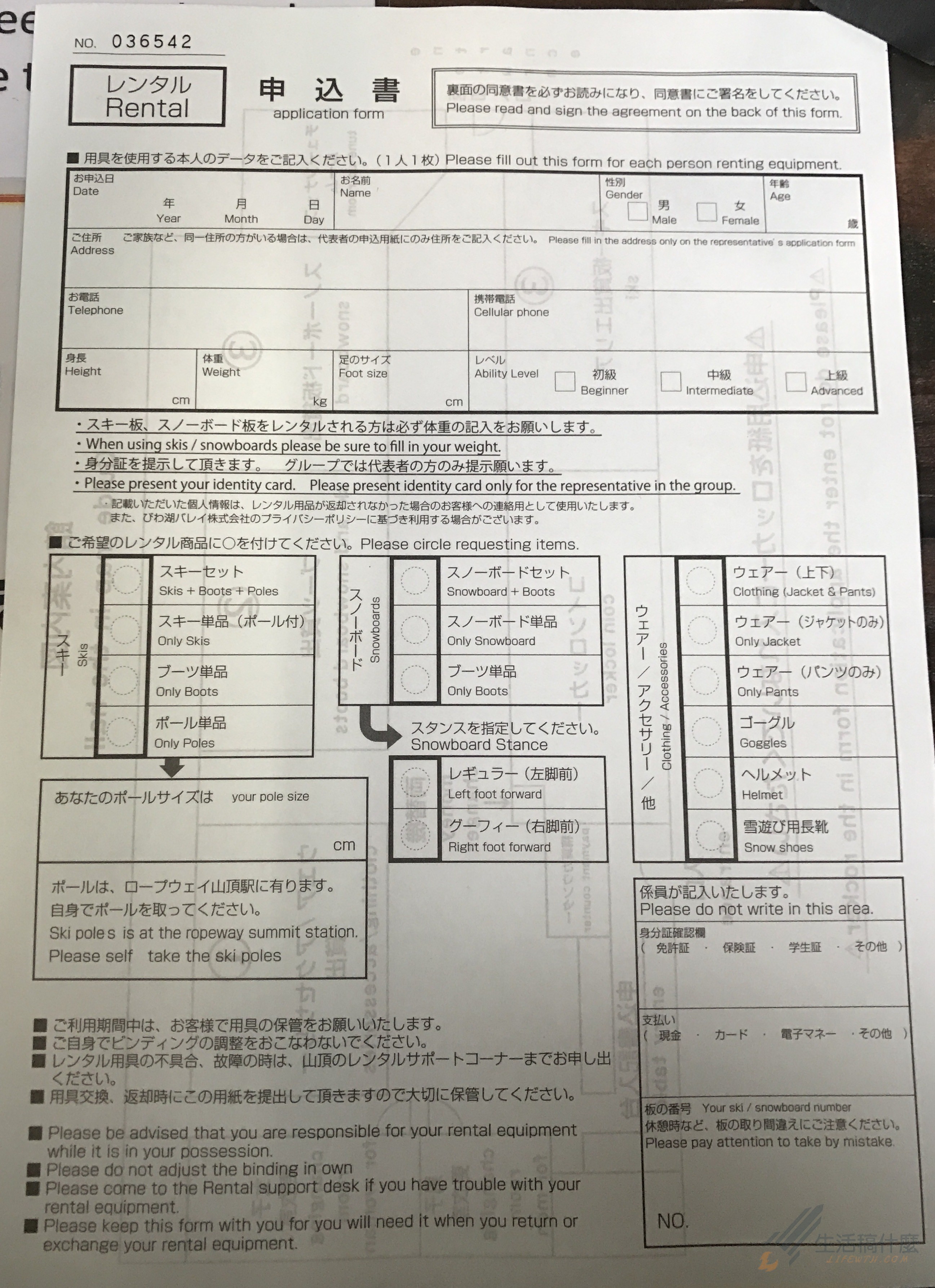 在租借雪具之前,首先需要填寫租借申請書,依照您的需求選擇需要租借的用具,看您當天是想要租借Skill或SnowBoard,由於雪衣、雪褲、風鏡與帽子…等裝備,小編當天都有自備因此當天只有選擇SnowBoard(雪板)+Boots(雪鞋),在租借雪板有分哪一隻腳在前哪一隻腳在後,如果您不知道該如何選擇的話有一種相當簡單的分辨方式,就是叫人在後面推您一把,看你第一步是哪一隻腳在前面就選擇那一邊。