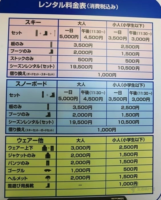 各種裝備租借費用如下圖,當天小編總共花了5000日圓租借雪板+雪鞋,如果您是常去滑雪的人建議衣服與褲子風鏡等都可以跟小編一樣去迪卡儂(點擊)購買,自己買除了較合身之外也相對較省錢。