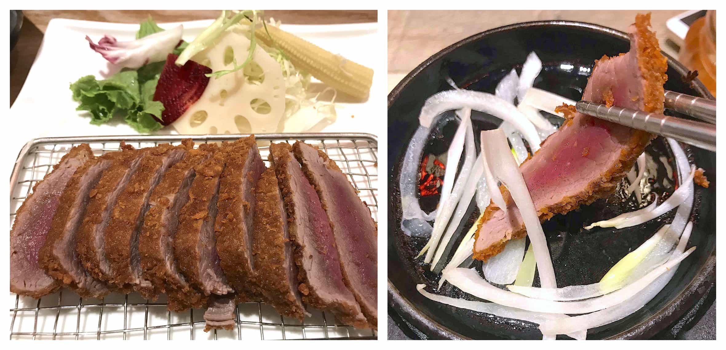 炸到金黃酥脆外皮搭配約5分熟的菲力牛肉,咬起來的口感相當軟嫩Q彈有嚼勁,並帶有些微酥脆口感相當美味。