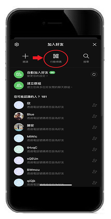 想要製作個人專屬的Line Qr code,首先必需開啟LINE APP → 在主頁中點擊右上角的紅圈圖示「加入好友」。