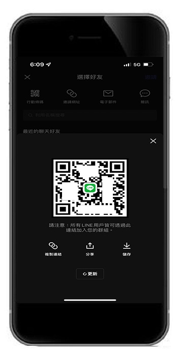 接下來螢幕上就會出現LINE群組的Qr code,我們可以點擊「分享」將它傳送給好友,也可以點擊