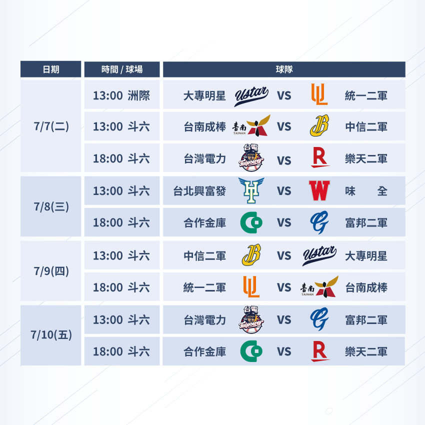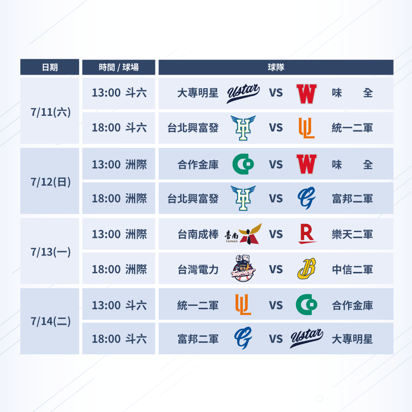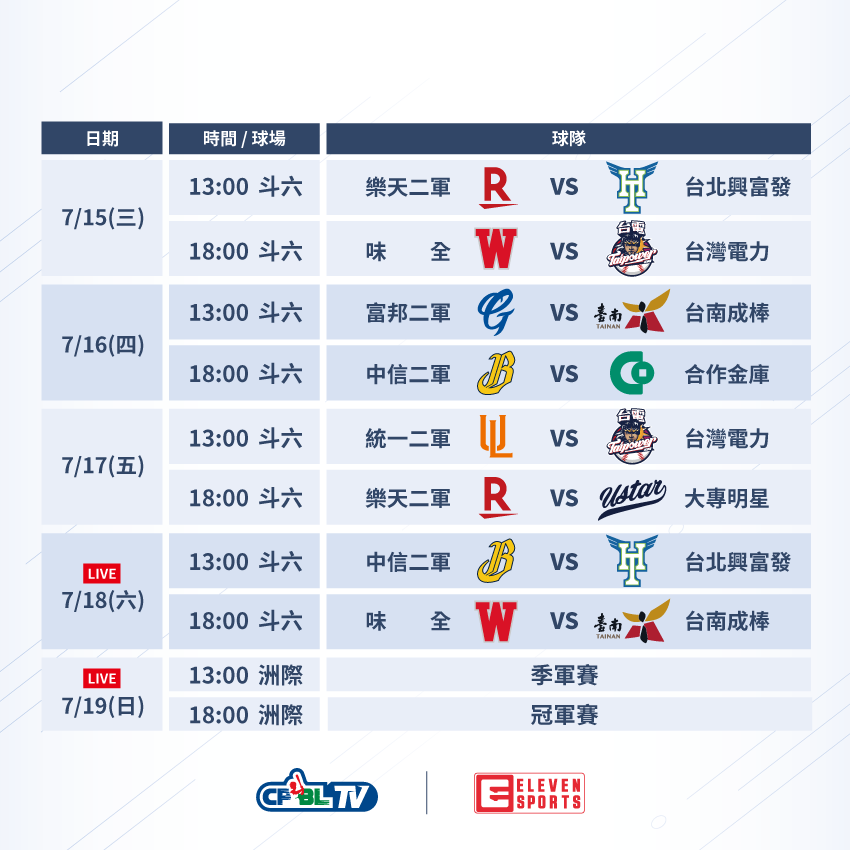 7/7 ~ 7/19中職二軍交流盃賽將於洲際棒球場與斗六棒球場兩地開打, 總冠軍與季軍戰將會安排在7/19號並將由eleven sport體育台提供LIVE轉播,而本屆中職交流盃賽程安排將不會讓中職五球隊互相對戰,將讓中職五球隊與業餘棒球隊以及大專棒球來個正式的三方交流,觀看中職二軍賽程請點擊下方連結前往!