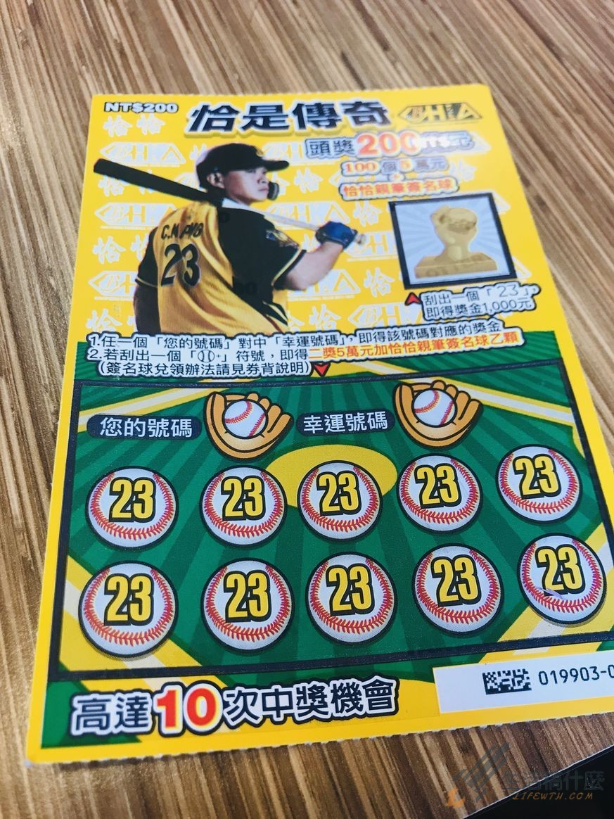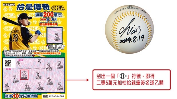 台彩刮刮樂「恰是傳奇」頭獎200萬有3個、2獎「5萬元」與「恰恰親筆簽名球乙顆」共100組,全由恰恰彭政閔親簽引退專屬簽名「CHIA23」。