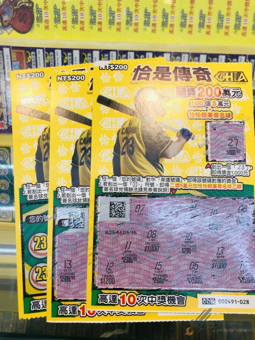當天小編與朋友皆買了不少張刮刮樂,恰恰彭政閔打擊率到目前為止有0.287,如果台彩表示中獎率比恰恰打擊率還高,小編覺得最差應該也會有一張中獎200元,小編還聽說刮刮樂尾數023號碼(恰恰彭政閔背號)相當熱門,非常多人在搶阿,小編去了好幾家店看都缺023這組號碼的刮刮樂,不知道這些買了023恰恰背號刮刮樂的朋友們有沒有中到大獎呢?