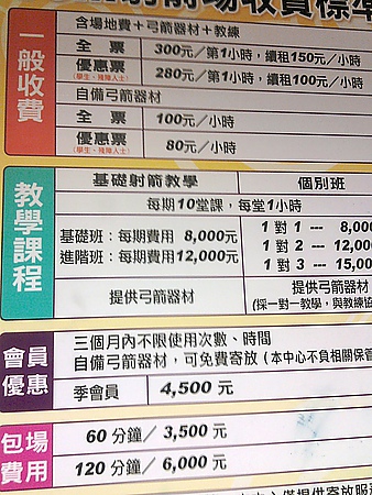 全票:300NT , 1HR (不限箭數,並且有教練來修正你的姿勢)
