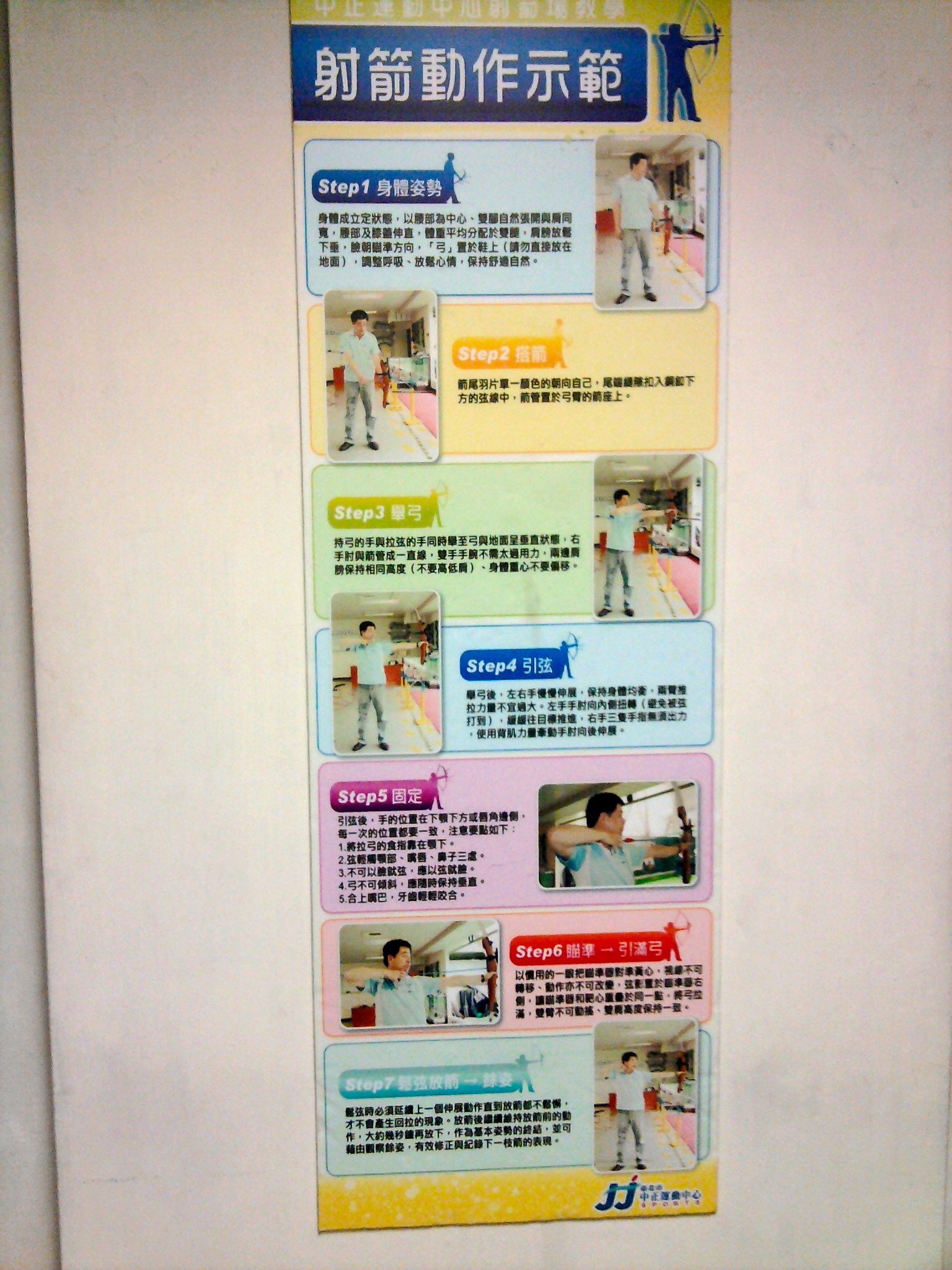 牆上貼的射箭的正確姿勢,由於我有時候手臂的姿勢不太正確,被弓懸打到了幾次!當下覺得並不太會痛回家才發現都瘀青了,而且體驗射箭約一小時手就覺得很酸箭弦就拉不太動了。下回我要努力的把我手臂的姿勢修正,並且挑戰20米的距離『滿靶』。