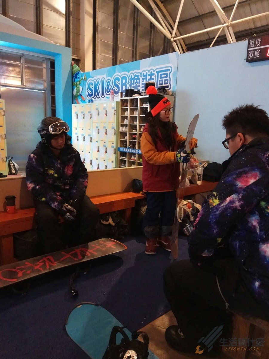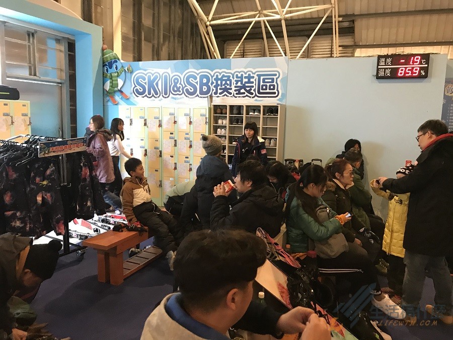 非常擁擠的滑雪場換裝區,換裝時因為現場沒有更衣間,請直接將雪衣跟雪褲套上即可,請注意要去小叮噹滑雪場時衣服千萬別穿得太厚重,因為滑雪屬於激烈運動,穿太厚滑到一半可是會滿身大汗的,另外請別帶太多行李來到滑雪場,雖然滑雪場有提供投幣式置物櫃,但因為來滑雪的人非常多,不一定會有空的置物櫃可以使用。