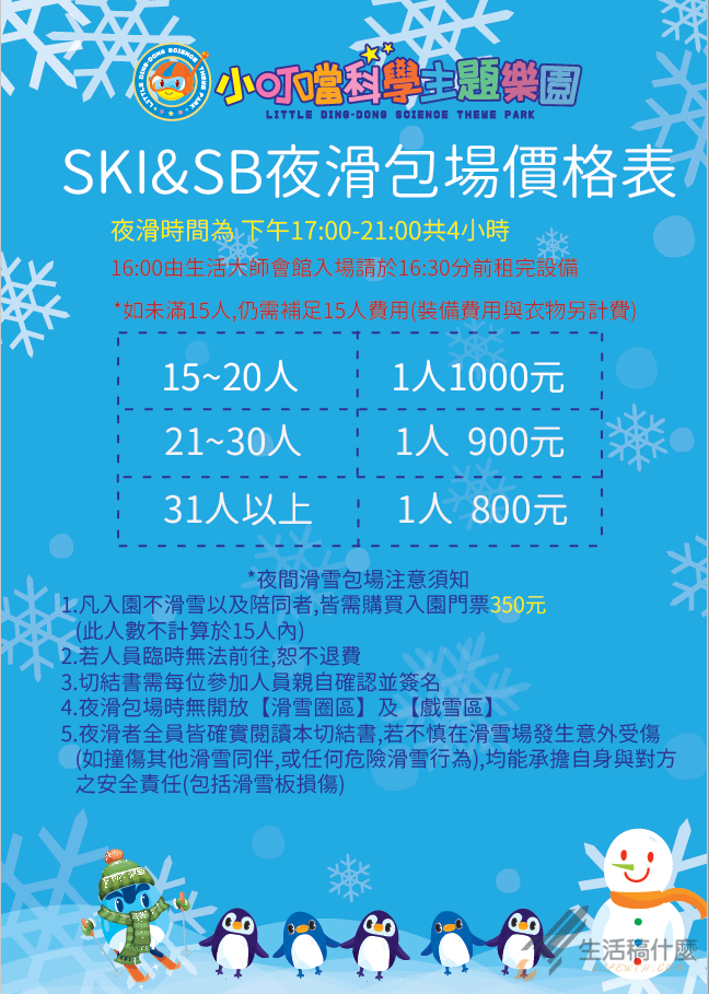 不喜歡小叮噹滑雪場白天時人擠人的環境嗎?只要您揪滿15位親朋好友就可以將小叮噹滑雪場包場4小時(17:00 ~ 21:00),並在夜晚享受與自己親朋好友的滑雪趣。