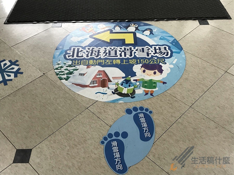 該如何從生活大師會館走到滑雪場呢?這可能是大家購票完首先會遇到的問題,首先請沿著會館地板上所貼的指引方向來前進吧。