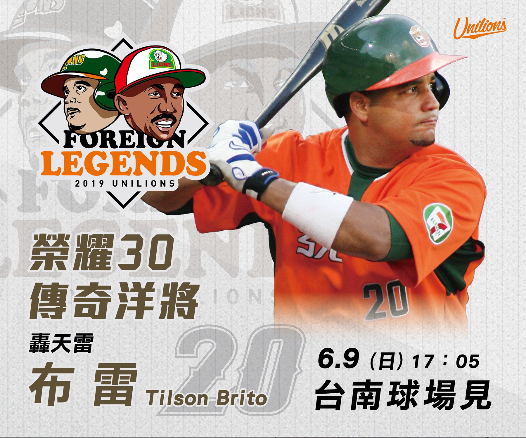 2019榮耀30統一獅傳奇洋將主題活動壓軸活動,6/9(日)由最強洋砲轟天雷布雷Tilzon Brito登場,這是布雷睽違十年再度回到台南棒球場與球迷相見歡,千萬別錯過與布雷再次見面機會!