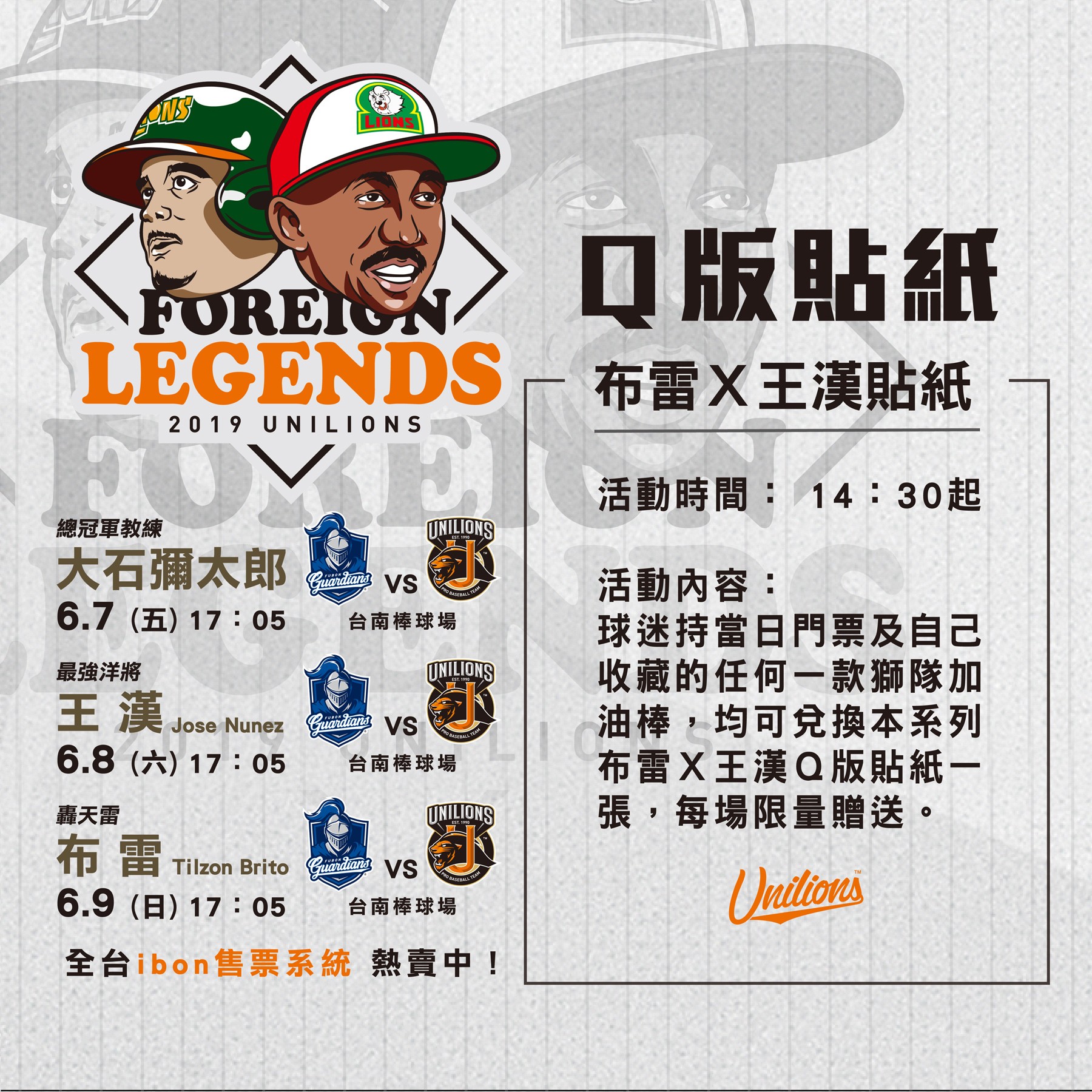 榮耀30統一獅傳奇洋將主題活動,週五~週日(6.7-9)連續三天,除了有獅隊二連霸總教練 大石彌太郎、最強洋將 王漢 Jose Nunez、轟天雷 布雷 Tilzon Brito舉辦主題活動與 中職統一獅》傳奇洋將主題系列珍藏商品限量開賣 之外,為了讓球迷能夠重回當時職棒熱潮,加油棒似乎成為必備應援道具之一,連續三天賽事,凡購買ibon預售票球迷者,當日14:30持預售票即可兌換「王漢 Jose Nunez及轟天雷 布雷 Tilzon Brito漫畫版風格加油棒」,每場限量1000組,數量有限,換完為止。